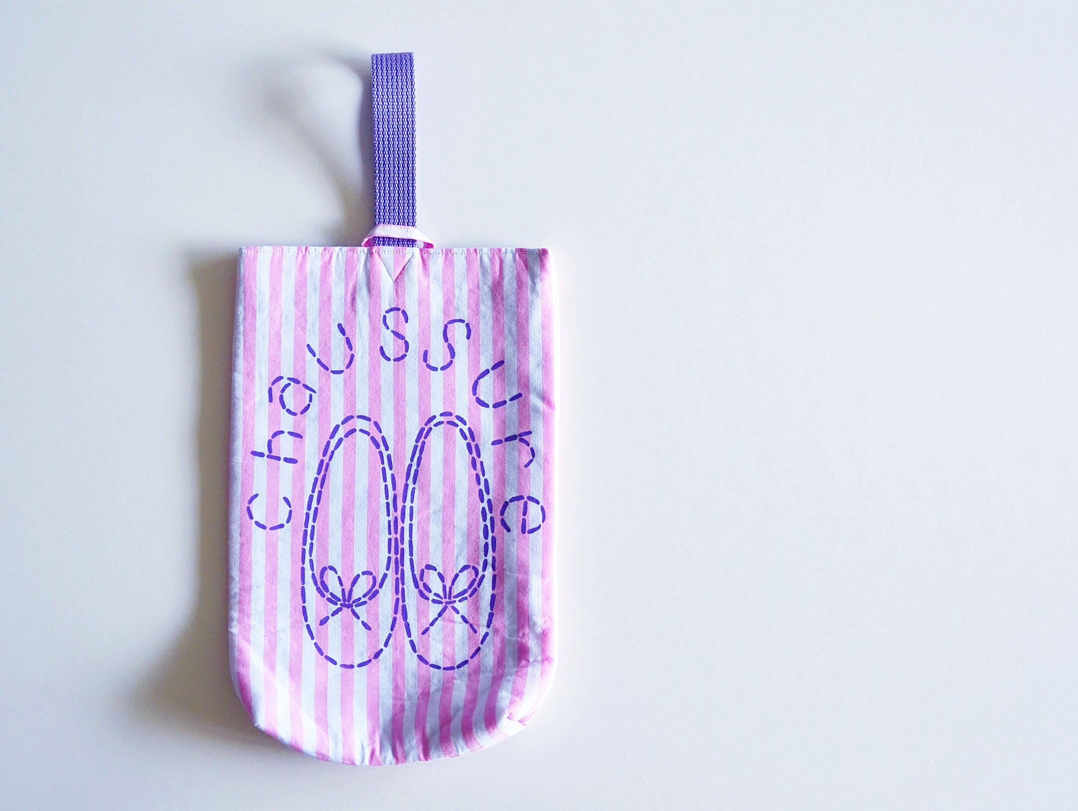 シューズバッグは、ダンスや体操の発表会などをイメージした靴のデザインと、フランス語で靴を意味する「chaussure」の文字をバッグ本体やハンドル部分のカラーと響きあうようにステッチ風にハンドペイントしました。