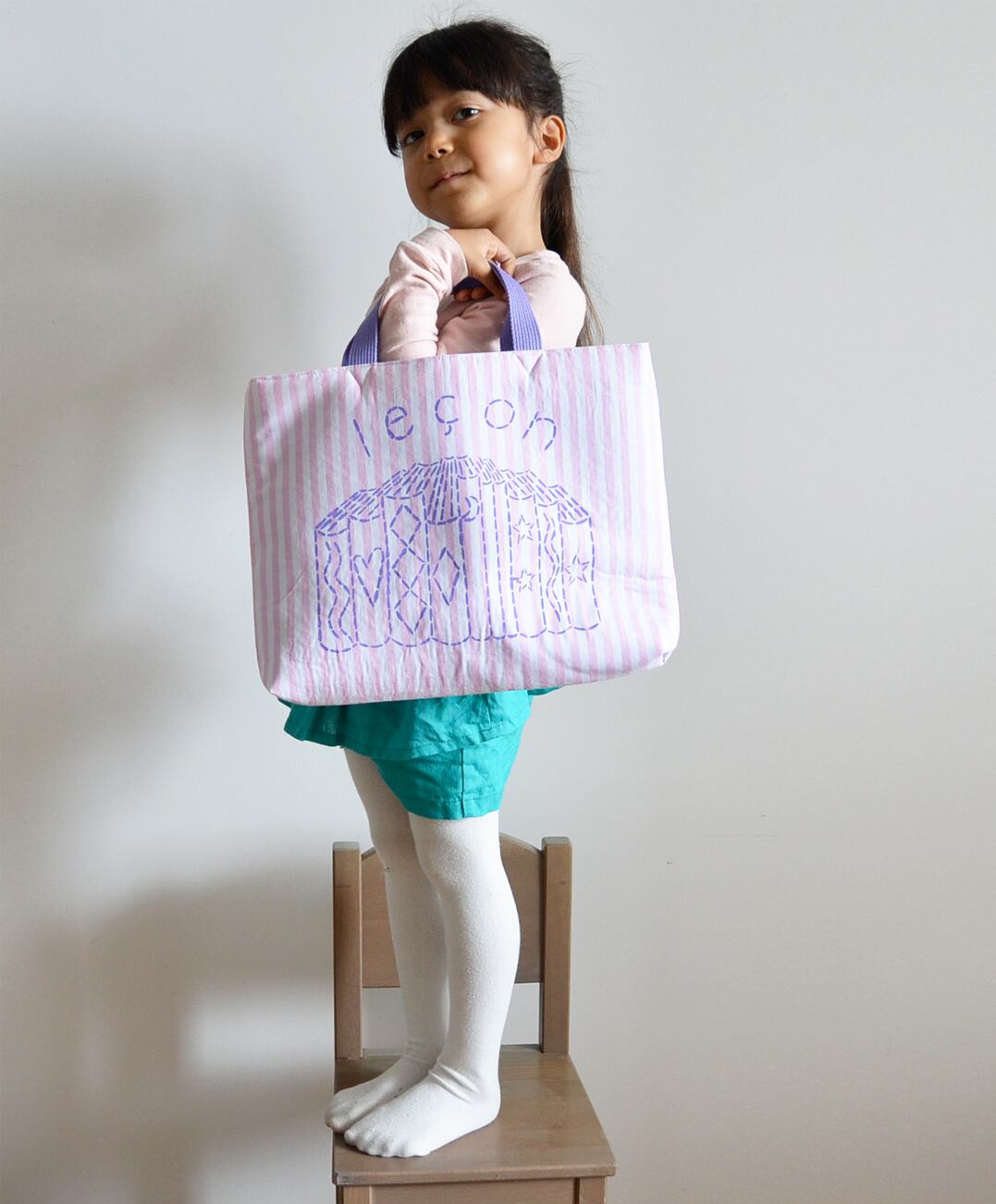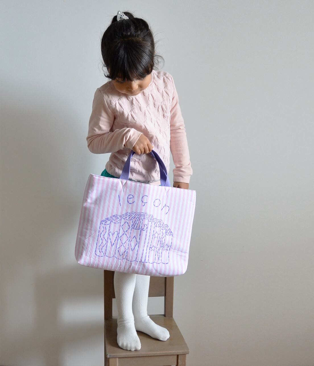 星やハートが背表紙になった本と、フランス語で授業やおけいこを意味す「leçon」の文字をバッグ本体やハンドル部分のカラーと響きあうように、ステッチ風にハンドペイントしました。