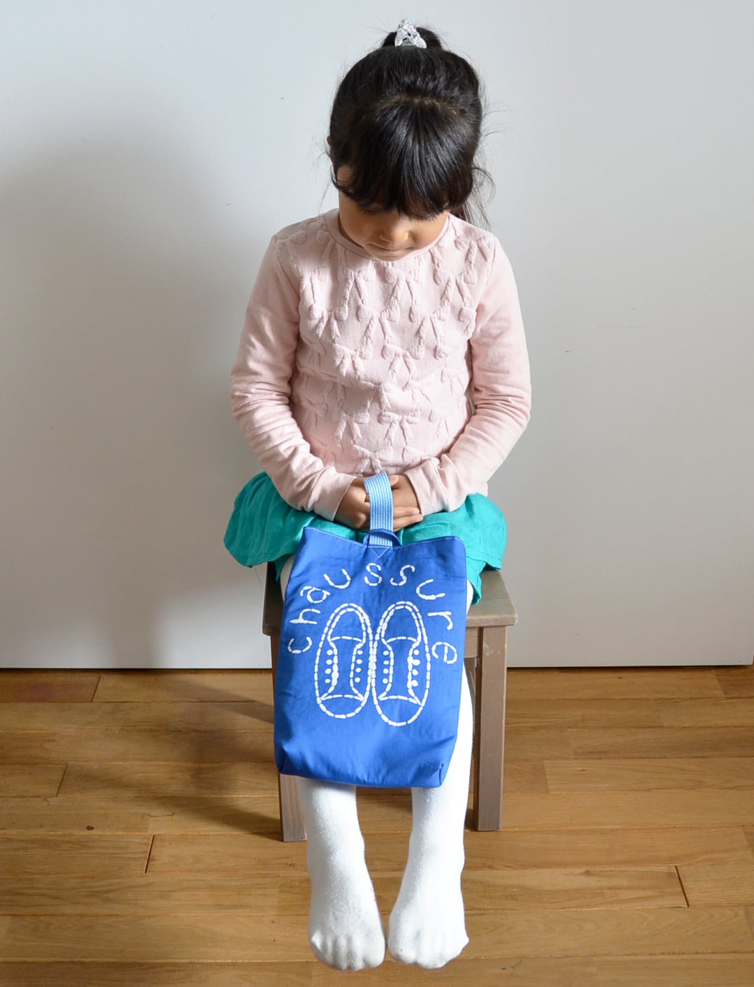シューズバッグは、ダンスや体操の発表会などをイメージした靴のデザインと、フランス語で靴を意味する「chaussure」の文字をバッグ本体やハンドル部分のカラーと響きあうようにステッチ風にハンドペイントしました。